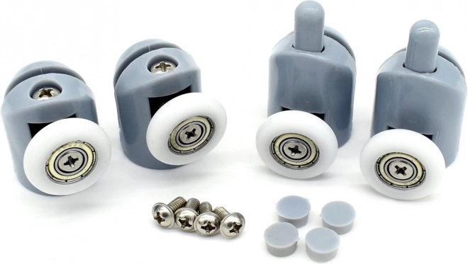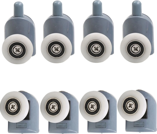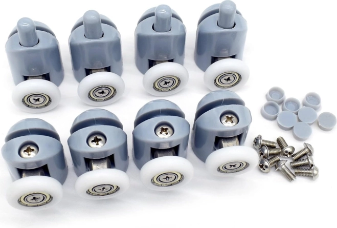 De set bevat acht wielen die zorgen voor een soepele en probleemloze beweging van de douchedeuren. Elk wiel heeft een stevige constructie van plastic en staal.