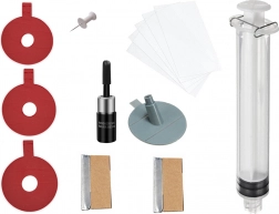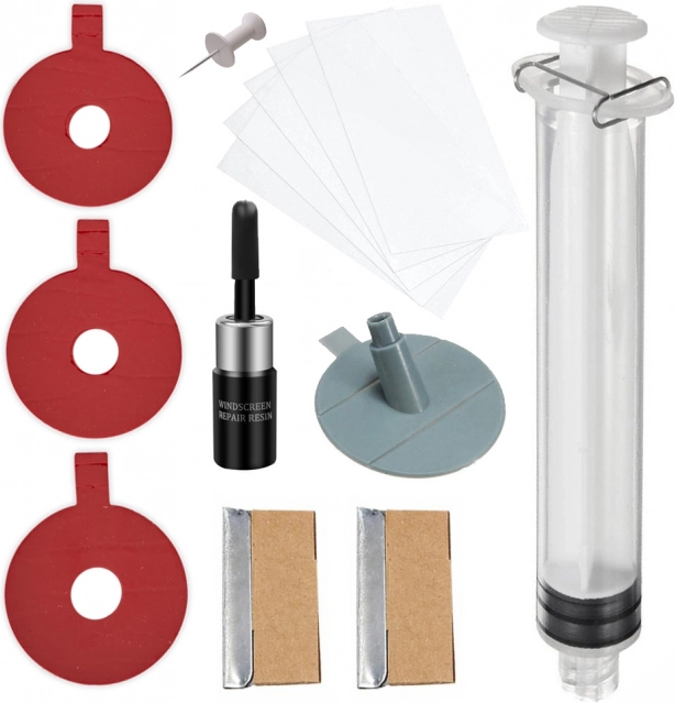In de verpakking zit alles wat je nodig hebt: een applicator met schroef om een vacuüm te creëren, een spuit, uithardingsfolie en een scheermesje voor de definitieve egalisatie van het oppervlak. De reparatie vindt plaats onder UV-licht of in direct zonlicht, waardoor het resultaat snel, sterk en langdurig is.