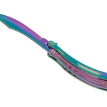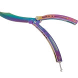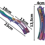 Het vlindermes heeft een prachtig iriserend oppervlak dat onmiddellijk de aandacht trekt. Dankzij hoogwaardige metalen bewerking is het ideaal voor zowel esthetisch genot als voor praktisch gebruik. De veiligheidsvergrendeling zorgt voor veilig dragen en hantering.