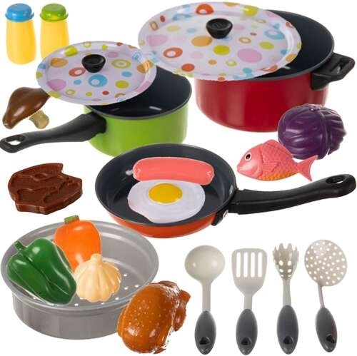 \r\nMet deze unieke speelgoedkeuken set kan elke kleine chef-kok zijn vleugels uitslaan en zijn eigen restaurant beginnen. Het bestaat uit 23 elementen waarmee uw kleintje zelf smakelijke gerechten kan maken. De set bevat onder andere: potten, ingrediënten voor het avondeten en accessoires die in elke keuken nodig zijn. Deze set zal een perfecte aanvulling zijn op elke speelkeuken.