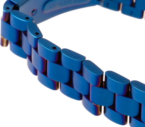 De schakels van roestvrij staal geven de armband een premium look en een lange levensduur, terwijl de blauwe uitvoering direct in het oog springt.