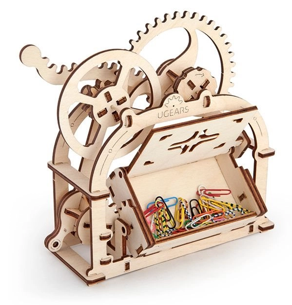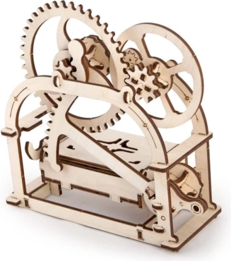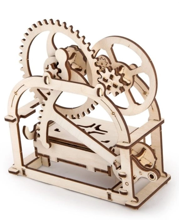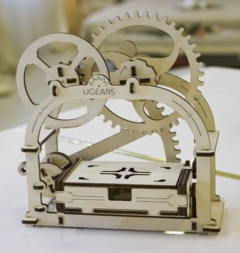 De mechanische doos van UGEARS combineert traditioneel materiaal met slimme beweging. Dankzij het ingenieuze tandwielsysteem hoef je alleen de zijdelingse hendel in te drukken en het deksel opent met een prettig klikgeluid. In de doos vind je twee voorpaneel-varianten – met en zonder uitsparing – afhankelijk van het beoogde gebruik.