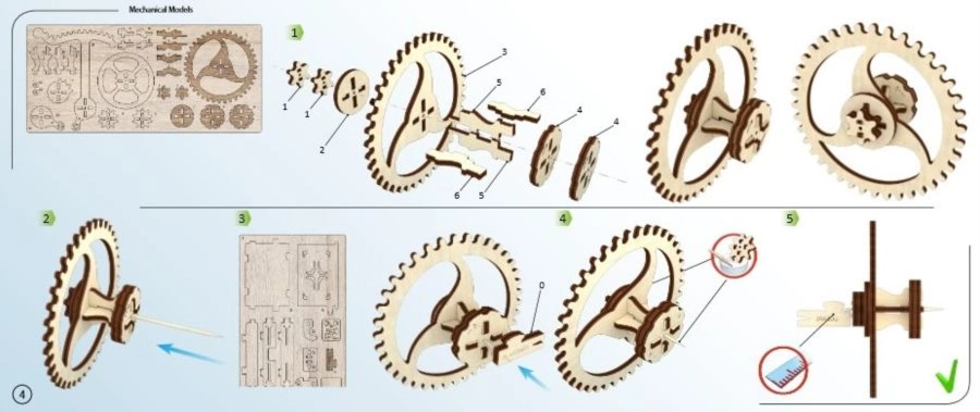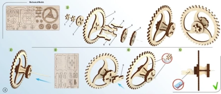Nauwkeurig uitgesneden houten onderdelen, een duidelijke geïllustreerde handleiding en aanbevolen waxen van de assen zorgen voor een vloeiende rotatie en probleemloze werking.