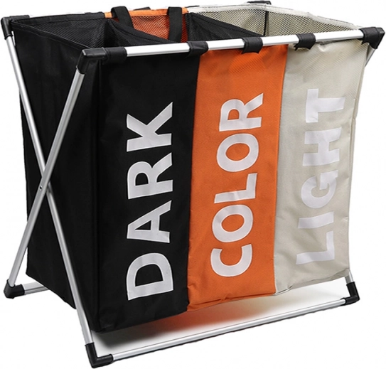 Driedelige wasmand met een driekleurig design is een praktische hulp voor elk huishouden. De mand heeft drie afzonderlijk afsluitbare compartimenten voor het sorteren van was, elk gelabeld en gemaakt van waterbestendig materiaal, wat duurzaamheid en gebruiksgemak garandeert.