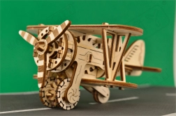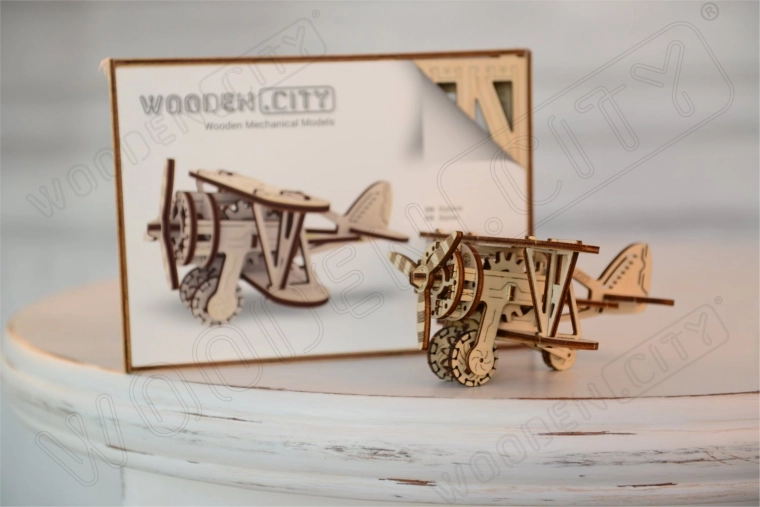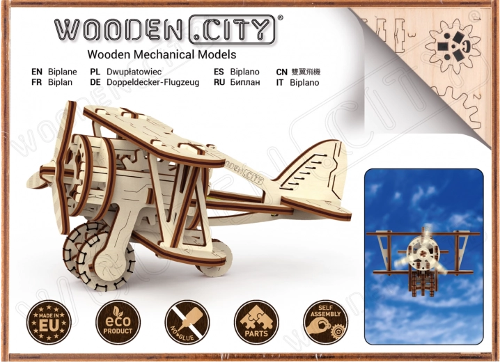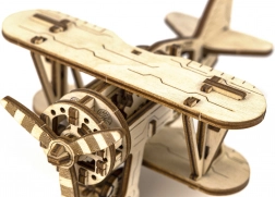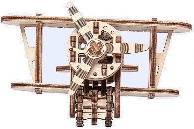 De houten mechanische bouwdoos in de vorm van een dubbeldekker biedt een uniek ontwerp en verrassende details. Met modellering precisie zul je luchtavonturen beleven naast luchtvaartpioniers zoals Antoine de Saint-Exupéry. Dit model wordt aangedreven door rubberen banden met instelbare acceleratie, die de propeller doen draaien en het vliegtuig laten versnellen op een vlakke ondergrond.