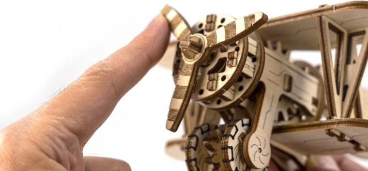 De bouwdoos is gemaakt van hoogwaardige berkenmultiplex en kan zonder lijm of gereedschap worden geassembleerd. De afmetingen van het gebouwde model zijn ongeveer 16,1 x 14 x 8,8 cm. Het is een geweldig cadeau voor luchtvaartliefhebbers en garandeert uren plezier en kennis van mechanische tandwielen en overbrengingen.