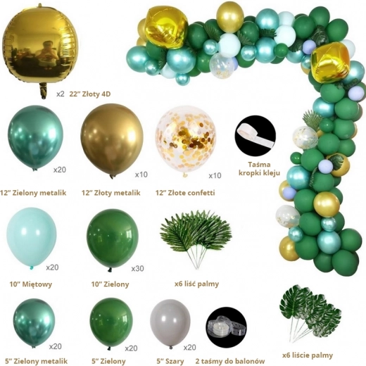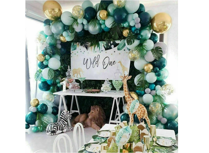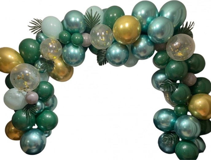 De montage is eenvoudig: vul de ballonnen met lucht of helium en bevestig ze aan het lint met oogjes. Plaats kleinere ballonnen rondom voor een volle, gelaagde look. Tropische en palmbladeren geven het geheel een exotische touch en passen perfect bij het groen-gouden palet.