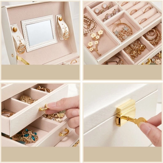 Onder de persoonlijke bezittingen van elke vrouw spelen sieraden een belangrijke rol. De meerlagige sieradenkist is een onmisbaar en betrouwbaar product voor het opbergen van uw kostbaarheden. De afzonderlijke vakken en lades bieden perfecte opbergruimte voor oorbellen, armbanden, horloges, kettingen, brillen en andere kostbaarheden. De sieradendoos lost het probleem op van in elkaar verstrengelde kettingen, schuren en krassen. Gouden, zilveren en kunstsieraden kunt u apart sorteren. De zachte voering beschermt uw kostbare sieraden tegen krassen. De sieradendoos heeft een grote afneembare spiegel, die geschikt is voor het passen van sieraden en voor het opmaken.