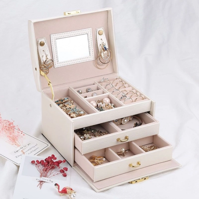 Onder persoonlijke bezittingen van elke vrouw spelen sieraden een belangrijke rol. Een meerlagige juwelendoos is een onmisbaar en betrouwbaar product voor het opbergen van uw kostbaarheden. De aparte vakken en lades bieden perfecte opbergruimte voor oorbellen, armbanden, horloges, kettingen, brillen en andere kostbaarheden. De sieradendoos verhelpt het probleem van in elkaar verwarde kettingen, slijtage en krassen. De zachte voering beschermt uw waardevolle sieraden tegen krassen. De juwelendoos heeft een grote afneembare spiegel, die geschikt is voor het passen van sieraden en voor het opmaken.
