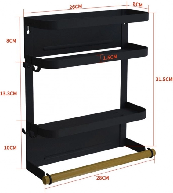 Praktische twee-laags magnetische organizer om orde te houden in een kleine keuken. Ideaal voor het opbergen van kruiden en keukengerei met directe toegang, waardoor extra ruimte ontstaat. Deze organizer is ontworpen om met sterke magneten op de koelkast te worden bevestigd, die een stevige grip garanderen, zelfs bij hoge belasting.