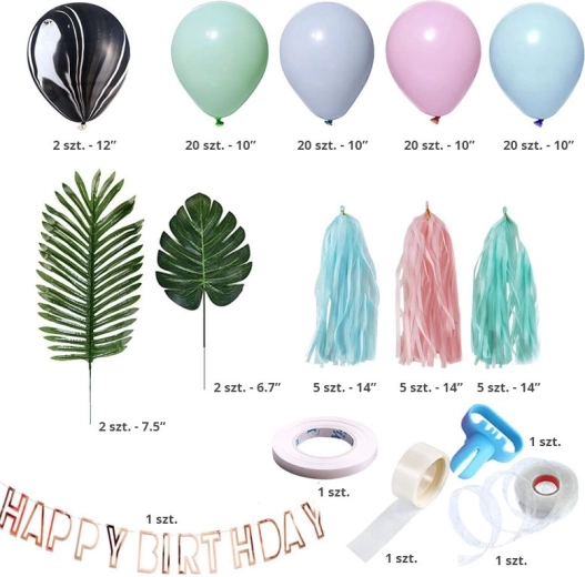 De krans kunt u zelf maken. U kunt meerdere guirlandes tot één grotere verbinden. Voor een geweldig effect kunt u enkele kleinere ballonnen opblazen en ze over de hele guirlande verdelen.