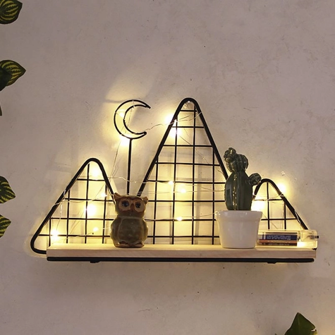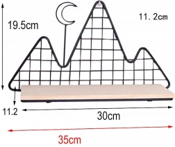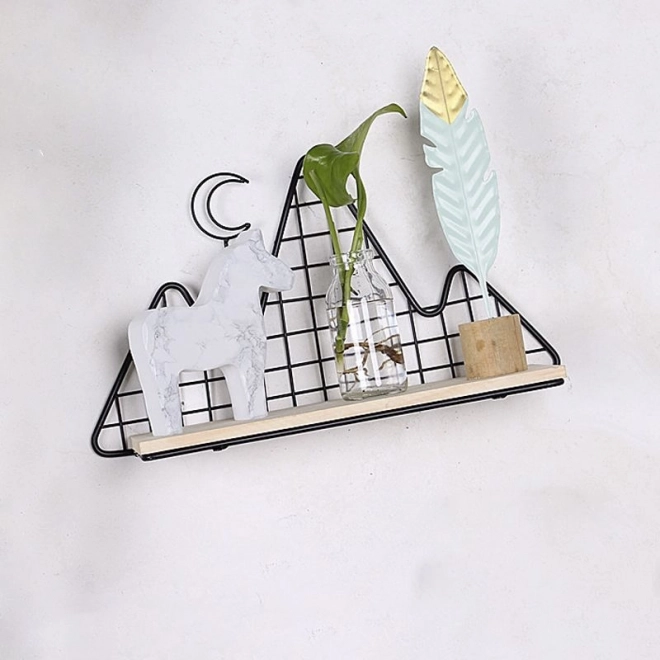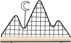 Deze decoratieve plank in elegant zwart combineert functionaliteit en design. De lichte draadconstructie met bergmotief oogt luchtig, terwijl de stevige houten plank veilig kleine decoraties, kaarsen, plantjes, fotolijstjes of favoriete boekjes draagt.