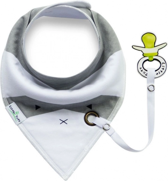 Praktisch kindersjaaltje/slabbetje met een afneembare fopspeenhouder in een universele wit‑grijze kleur. Biedt een zachte katoenen stof die huidvriendelijk is, een verstelbare omtrek met drukknoopjes en dient als een stijlvolle nekbescherming én functionele slab voor de doorkomperiode.