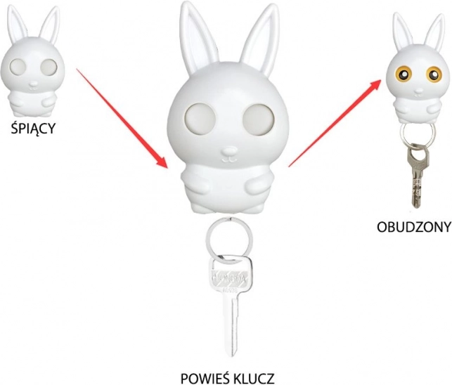 Een sleutelrek, ideaal voor in de hal, waar je bij thuiskomst je sleutels kunt ophangen. Zodra je de sleutels ophangt, opent het konijn zijn ogen zodat je erop kunt letten. Door het rek direct naast de uitgang te plaatsen, vergeet je je sleutels nooit meer; de geopende ogen van het konijn zullen je er zeker aan herinneren.