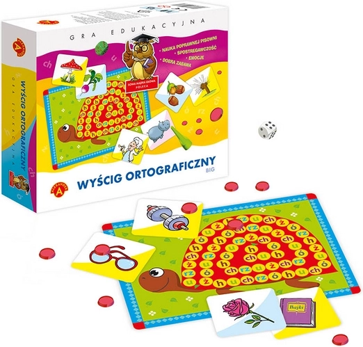 Een geweldige manier om snel en effectief de juiste spelling te leren. De worp met de dobbelsteen bepaalt hoeveel velden de pion op het speelbord vooruit gaat. Het spel bestaat eruit zo snel mogelijk tussen de kaartjes op tafel het plaatje te vinden dat het woord illustreert met de letter uit het vakje waarop de pion is blijven staan. Tijdens het spel oefenen we het juiste gebruik van lastige letters zoals: "rz", "ż", "ch", "h", "ó" en "u".