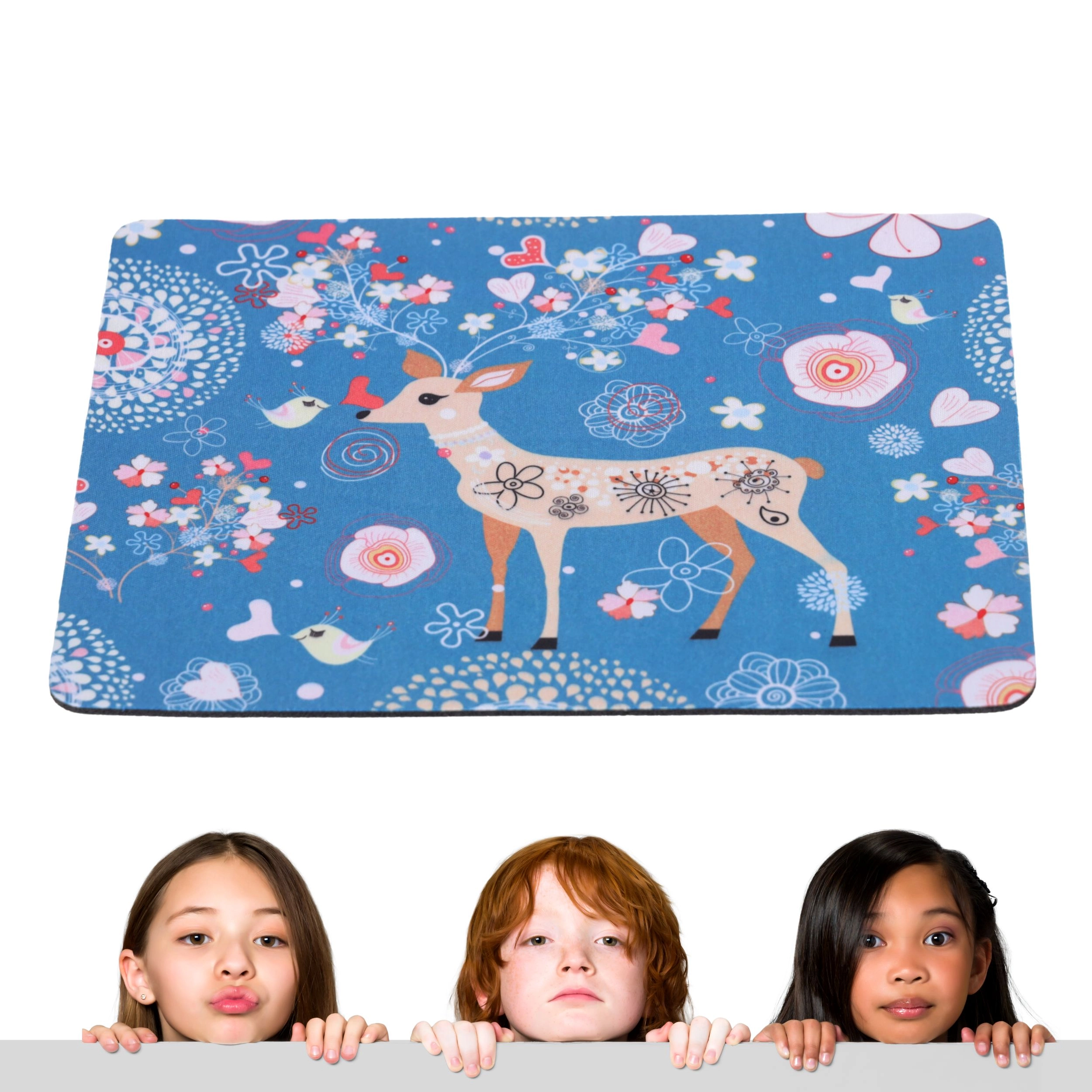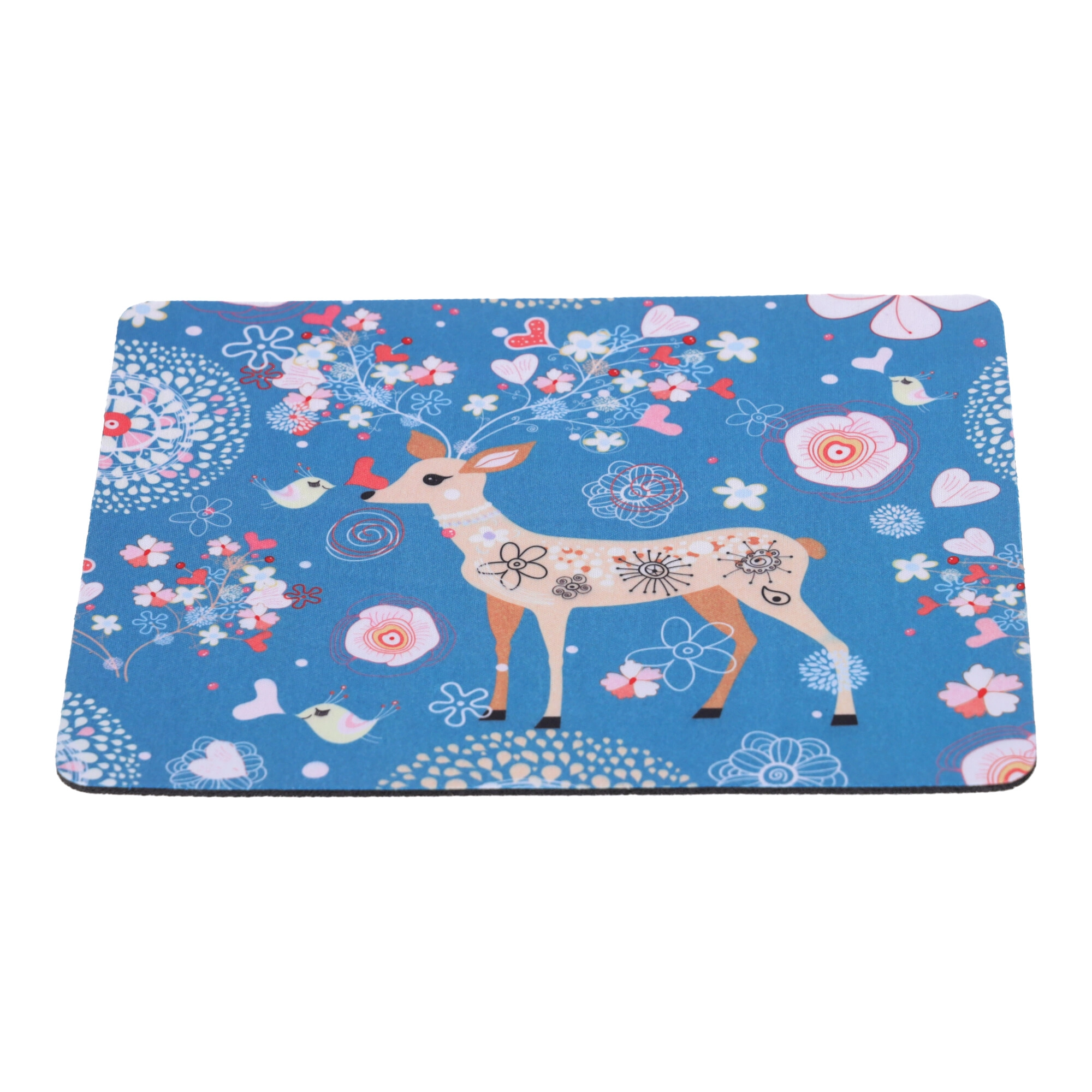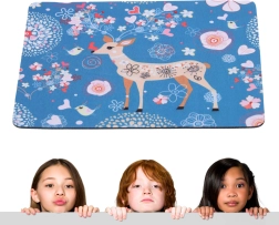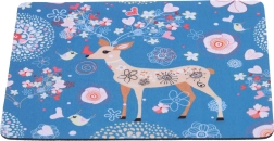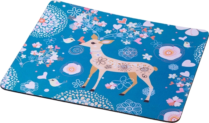 Deze decoratieve muismat met een zachte blauwe achtergrond en een speels herten-, vogel- en bloemenmotief verfraait elk bureau. Het textiele oppervlak zorgt voor een vloeiende muisbeweging en hoge cursorprecisie, terwijl de rubberen onderzijde de mat stevig op zijn plaats houdt.