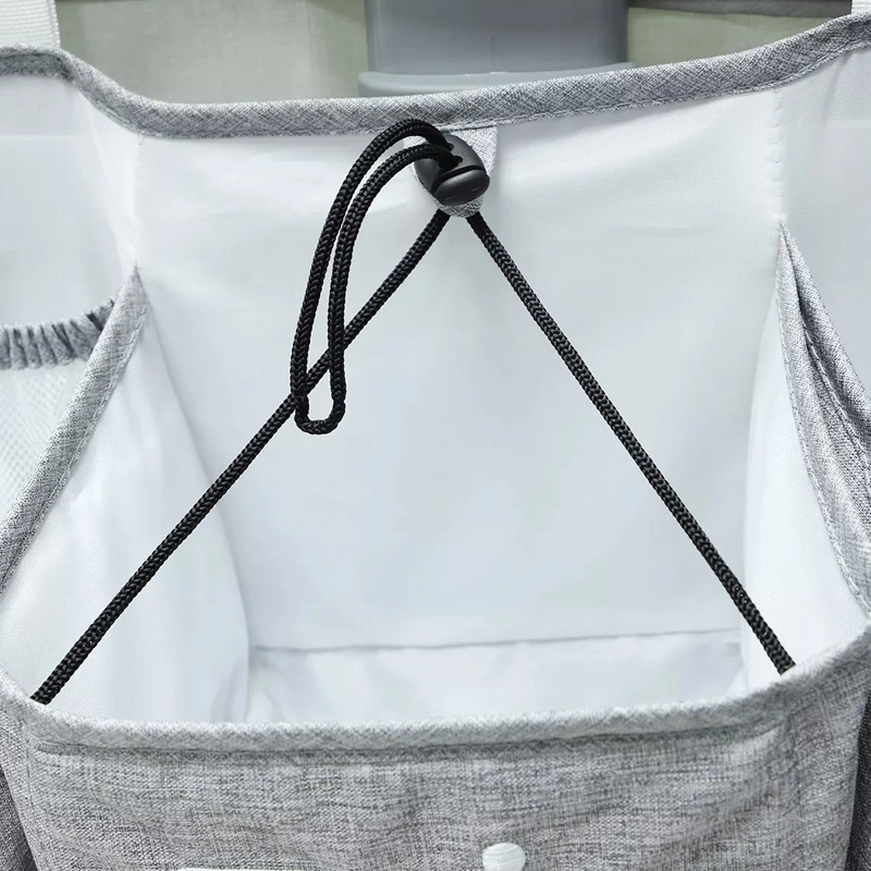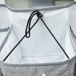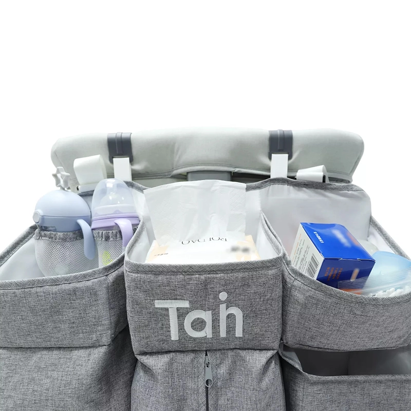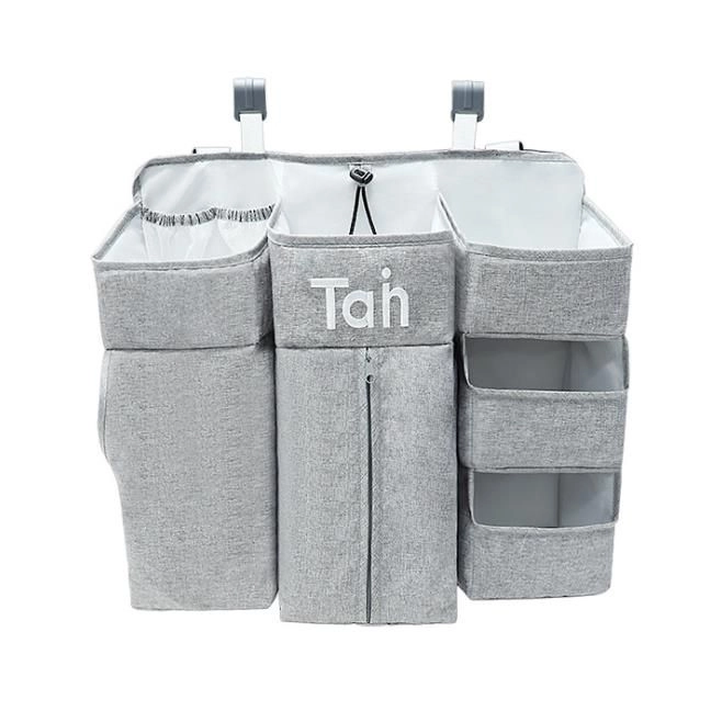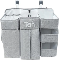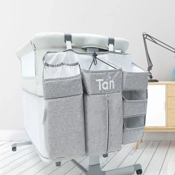 Praktische grijze organizer voor de babywieg houdt alle benodigdheden overzichtelijk binnen handbereik. Biedt meerdere vakken, legplanken en een afsluitbaar vak met rits voor luiers, meshvakken voor kleinigheden en universele bevestiging aan wieg, commode, deur of in de kast.
