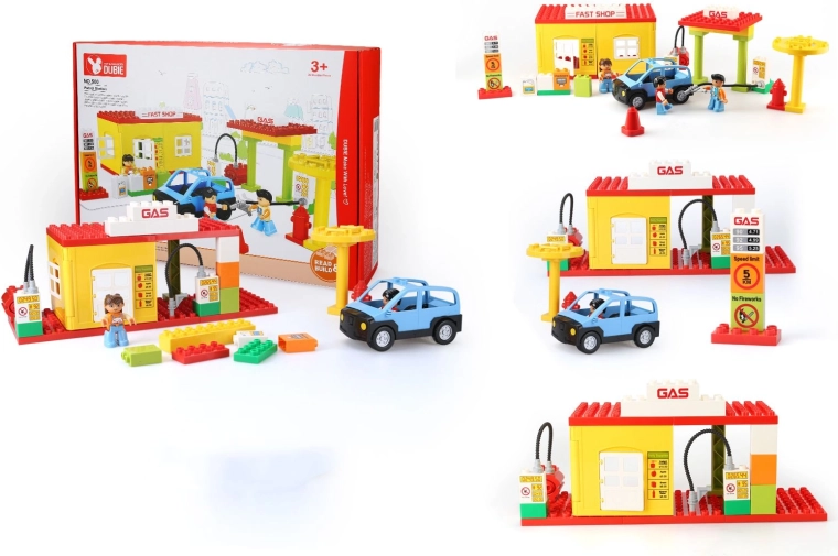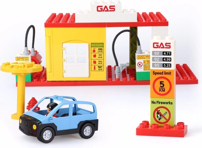 Speelgoedtankstation voor kinderen. Rijd met je voertuig naar binnen en vul de tank bij. De set bevat twee figuurtjes en een bouwinstructie.
