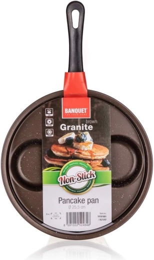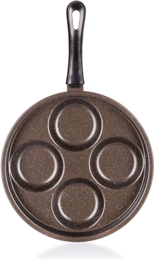 Deze 4-vaks pannenkoekenpan in elegant bruin combineert duurzaam koolstofstaal met een gespikkeld GRANITE antiaanbakoppervlak, zodat het beslag niet aankoekt en de pannenkoekjes gemakkelijk loskomen. De diameter van 24 cm is ideaal voor dagelijks koken en compacte opslag.