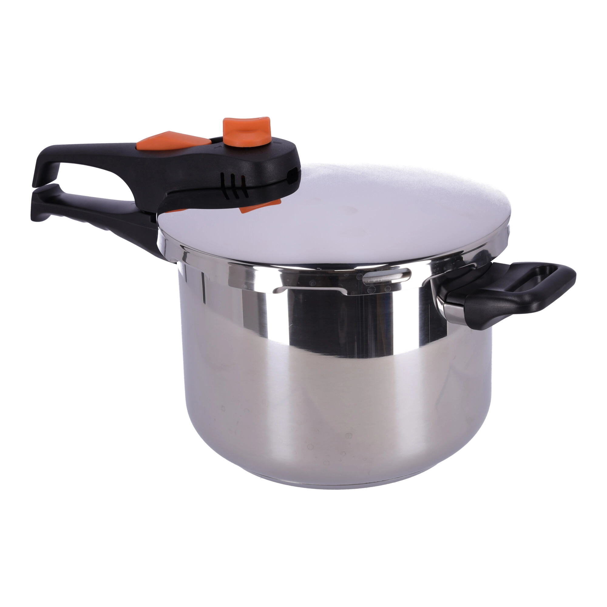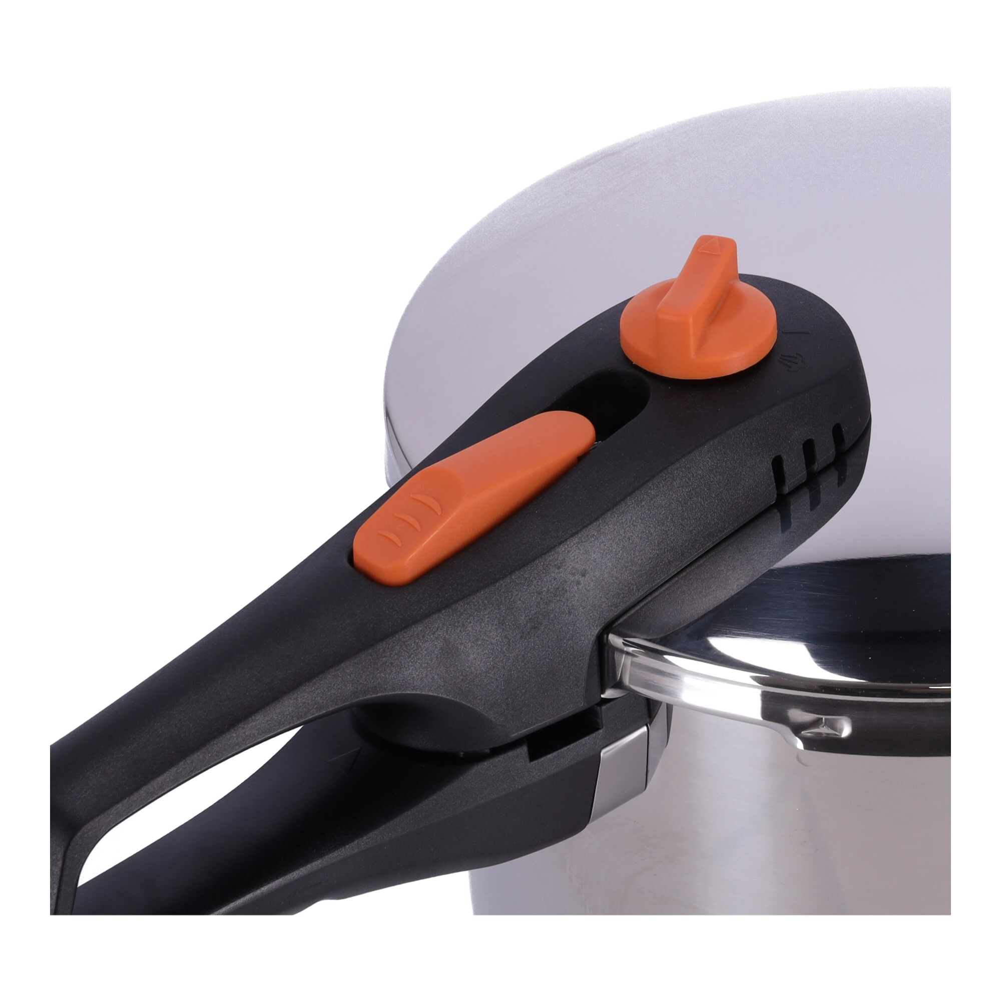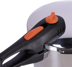 Dankzij de twee drukinstellingen (0,6 / 0,9 bar) pas je de bereiding eenvoudig aan verschillende ingrediënten aan – van peulvruchten en vlees tot groenten. De siliconen afdichting houdt de druk betrouwbaar vast, ergonomische handgrepen liggen prettig in de hand en de pan is compatibel met alle warmtebronnen, inclusief inductie.
