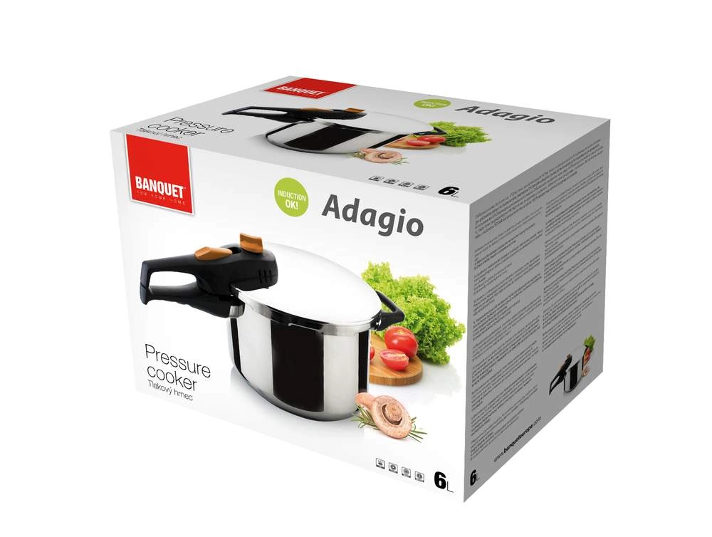 De snelkookpan BANQUET ADAGIO met een inhoud van 6 liter versnelt de bereiding van je favoriete gerechten, behoudt meer vitamines en mineralen en bespaart tegelijk tijd en energie. Robuust rvs 18/8, een wanddikte van 1 mm en een sandwichbodem van 5 mm zorgen voor stabiele opwarming en een lange levensduur. De veilige bajonetsluiting, het werkopening-/ventielsysteem en de blokkering tegen openen onder druk garanderen rustig en comfortabel gebruik.