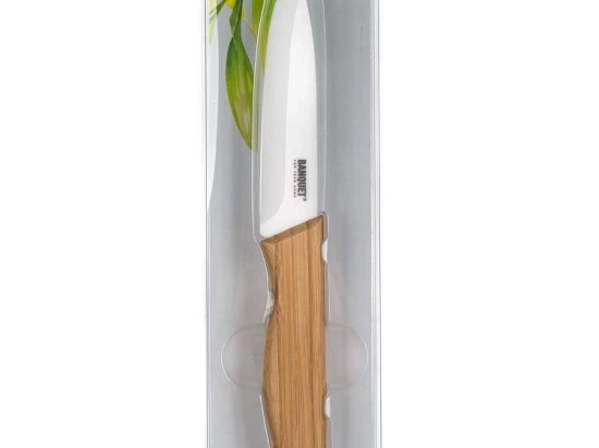 Praktisch keramisch mes ACURA BAMBOO 20 cm, keramisch lemmet (zirkoniumoxide) lengte 10 cm, lemmetdikte 1,6 mm, bamboe handgreep. Het lemmet van het keramische mes is gemaakt van een keramisch materiaal genaamd zirkoniumoxide. Deze samenstelling wordt gekenmerkt door hoge hardheid en sterkte. De ergonomische handgreep is gemaakt van TPR met een antislip oppervlak. Het mes is zeer vlekbestendig en gemakkelijk te reinigen. Het lemmet laat geen zuren uit voedingsmiddelen door. Dankzij het keramische lemmet gaan vitamines in voedsel niet verloren. Vlees, groenten en fruit blijven niet aan het mes kleven. Het mes heeft een zeer laag gewicht en een uitgebalanceerd zwaartepunt, waardoor het tijdens het werk gemakkelijk te hanteren is. Keramische messen zijn harder dan metalen messen en hoeven daarom niet dagelijks geslepen te worden zoals stalen messen. De keerzijde van hun hoge hardheid is hun broosheid, daarom wordt het niet aanbevolen om er bijvoorbeeld botten mee te snijden, het mes te wrikken tijdens het snijden of het mes te laten vallen.