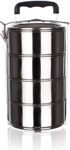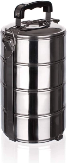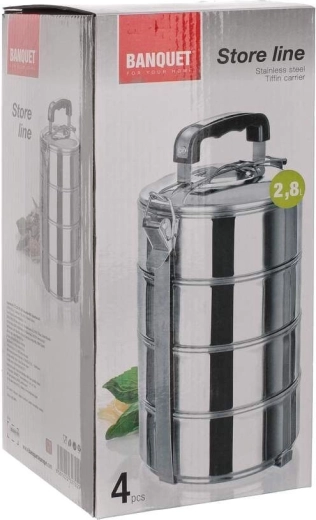 De set voedselcontainers STORY LINE 4 stuks van roestvrij staal is bedoeld voor het vervoeren van etenswaren en bereide maaltijden. De set bevat 4 roestvrijstalen kommen met een diameter van 13 cm en een hoogte van 5,7 cm. Totale hoogte van de set 21,8 cm, materiaaldikte 0,5 mm.