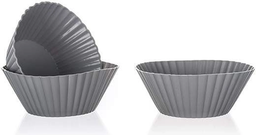 Set van 6 siliconen muffinvormpjes van het merk Allegra, bevat 3 grijze en 3 crèmekleurige vormpjes met een afmeting van 7,5 x 3 cm. Gebakken deeg haal je er gemakkelijk uit en ze zijn herbruikbaar, wat milieuvriendelijk is.