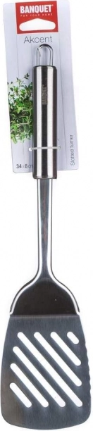 De spatel met gaten Banquet Akcent is het ideale gereedschap voor gemakkelijk omgaan met voedsel tijdens het koken. Het is vervaardigd uit hoogwaardig roestvrij staal, wat zorgt voor een lange levensduur en weerstand tegen roest. Dankzij de handige lus kun je hem gemakkelijk ophangen.