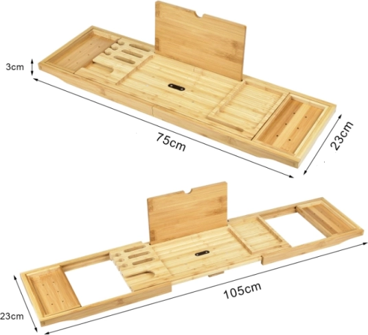 De perfecte oplossing om een spa-omgeving te creëren in uw badkamer. De bamboe badplank is ontworpen om op verschillende maten en vormen van baden te passen. Klaar voor onmiddellijk gebruik zonder montage. Inclusief gleuf voor een tablet en een speciale wijnglashouder, wat volledige ontspanning tijdens het baden mogelijk maakt.