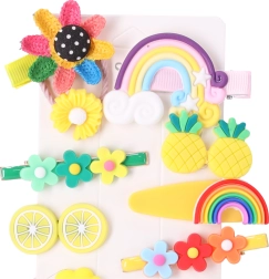 Een schattige set van 14 kleurrijke haarspeldjes voor meisjes die stijl en functionaliteit combineert. Verschillende vormen en motieven – van bloemen tot regenbogen en fruit – houden het kapsel stevig op zijn plek en geven zowel dagelijkse als feestelijke outfits een speelse touch. Ideaal voor peuterspeelzaal, school en bruiloften of doopfeesten.