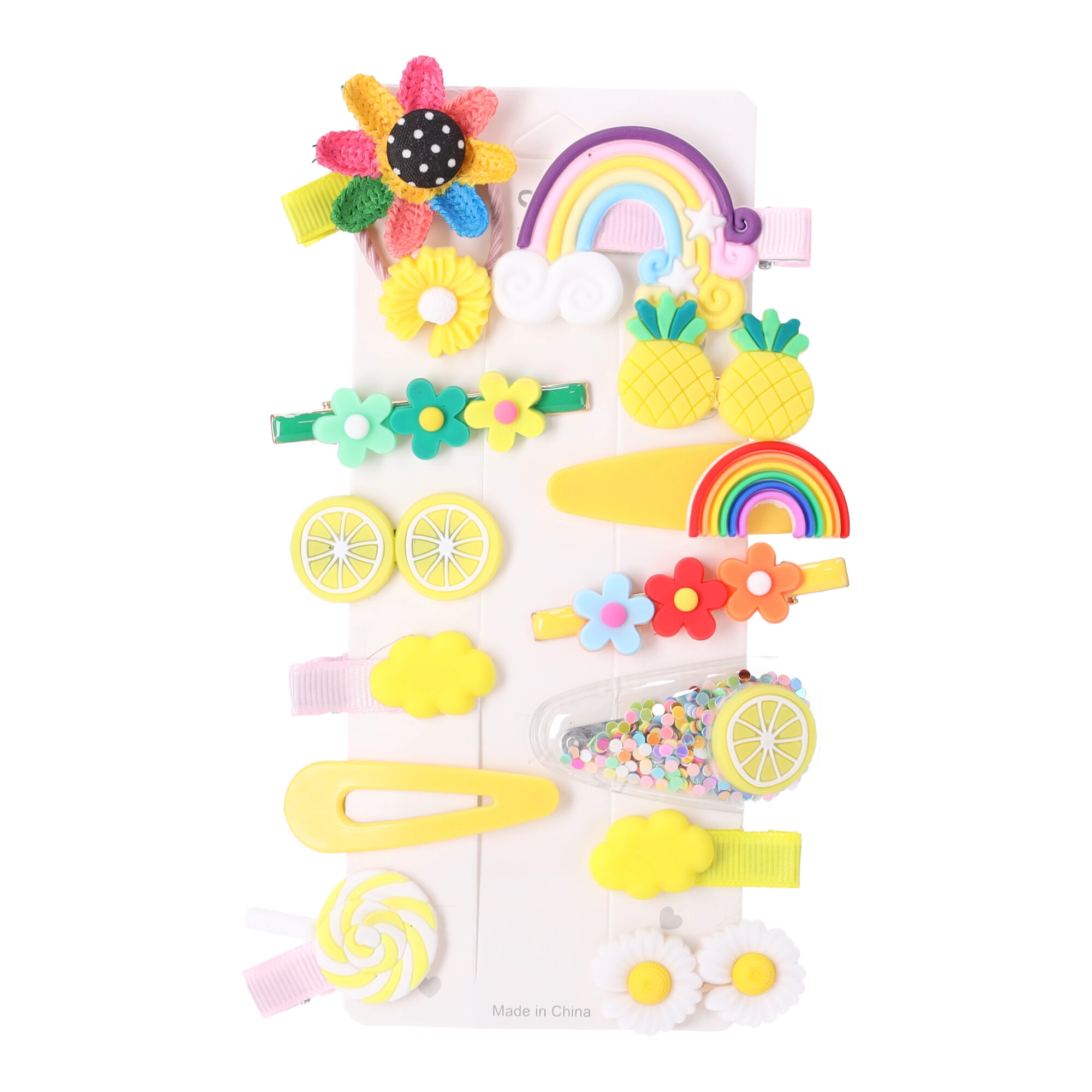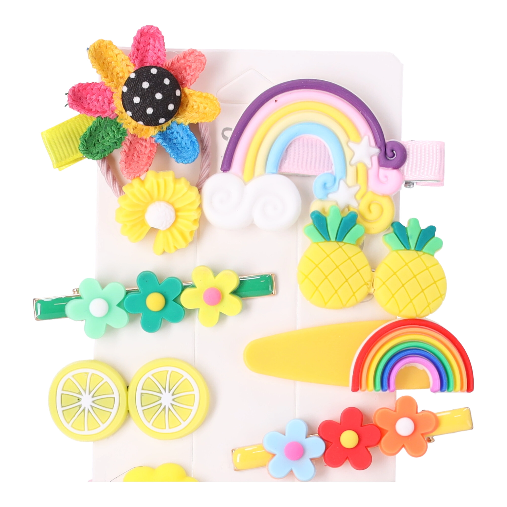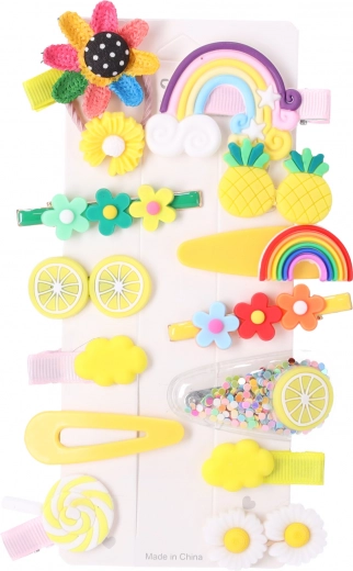 De set van 14 stuks biedt bloemen, regenbogen, fruit en wolkjes in pastel- en glinsterende tinten. Gemakkelijk te combineren met kleding en gelegenheid.