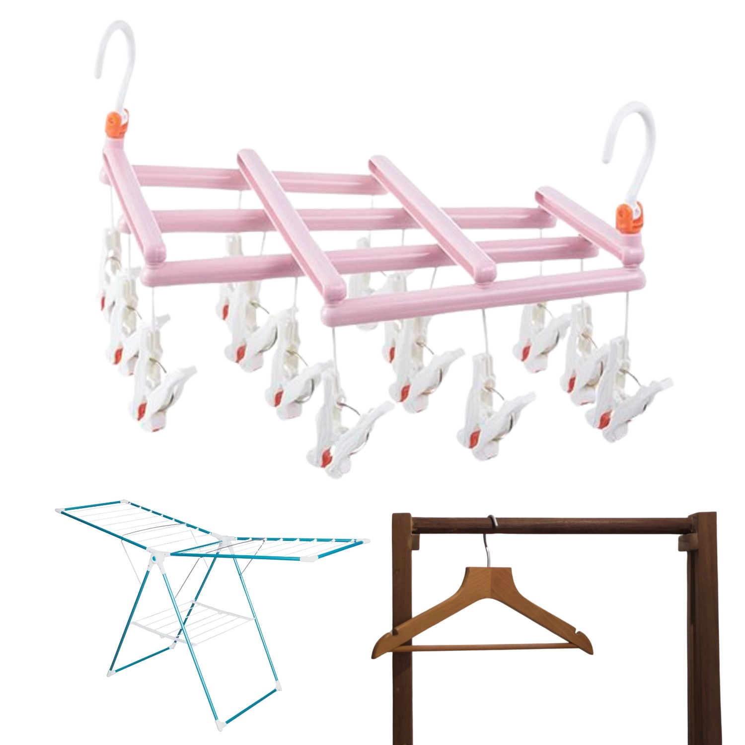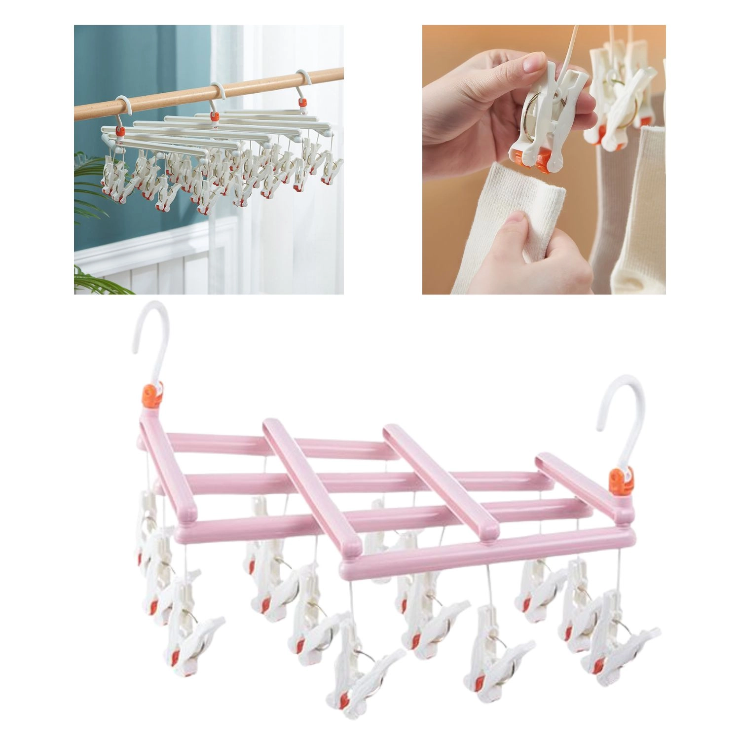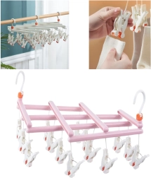 Houd orde tijdens het drogen en benut elke centimeter ruimte. Dit roze droogrek met 14 stevige knijpers biedt snel en overzichtelijk ophangen van kleinere stukken was. De draaibare haak maakt eenvoudig ophangen aan een stang, waslijn, balkon of droogrek mogelijk en het opvouwbare ontwerp vergemakkelijkt opbergen en meenemen.