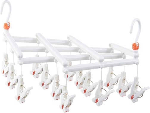 Praktisch opvouwbaar droogrek met 14 wasknijpers, ideaal voor het drogen van sokken, ondergoed en kleine stukken was, zowel binnen als buiten. Dankzij de draaibare haak en de compacte afmetingen bespaart het ruimte en is het gemakkelijk in gebruik. Duurzame kunststof, veilige wasknijpers tegen wegglijden en een opvouwbare constructie voor eenvoudig opbergen maken dit droogrek tot een geweldige hulp in elk huishouden.