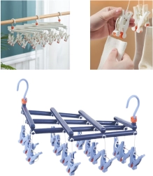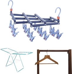 Ontdek een betrouwbare oplossing voor het dagelijks drogen van klein wasgoed. Het opvouwbare droogrek met 14 stevige clips is gemaakt van hoogwaardige, vochtbestendige kunststof, waardoor je het zorgeloos binnen en buiten kunt gebruiken. De draaibare haak met vergrendeling zorgt voor stabiel ophangen waar je maar wilt – aan een balkonreling, droogrek, kledingroede of kampeerlijn.