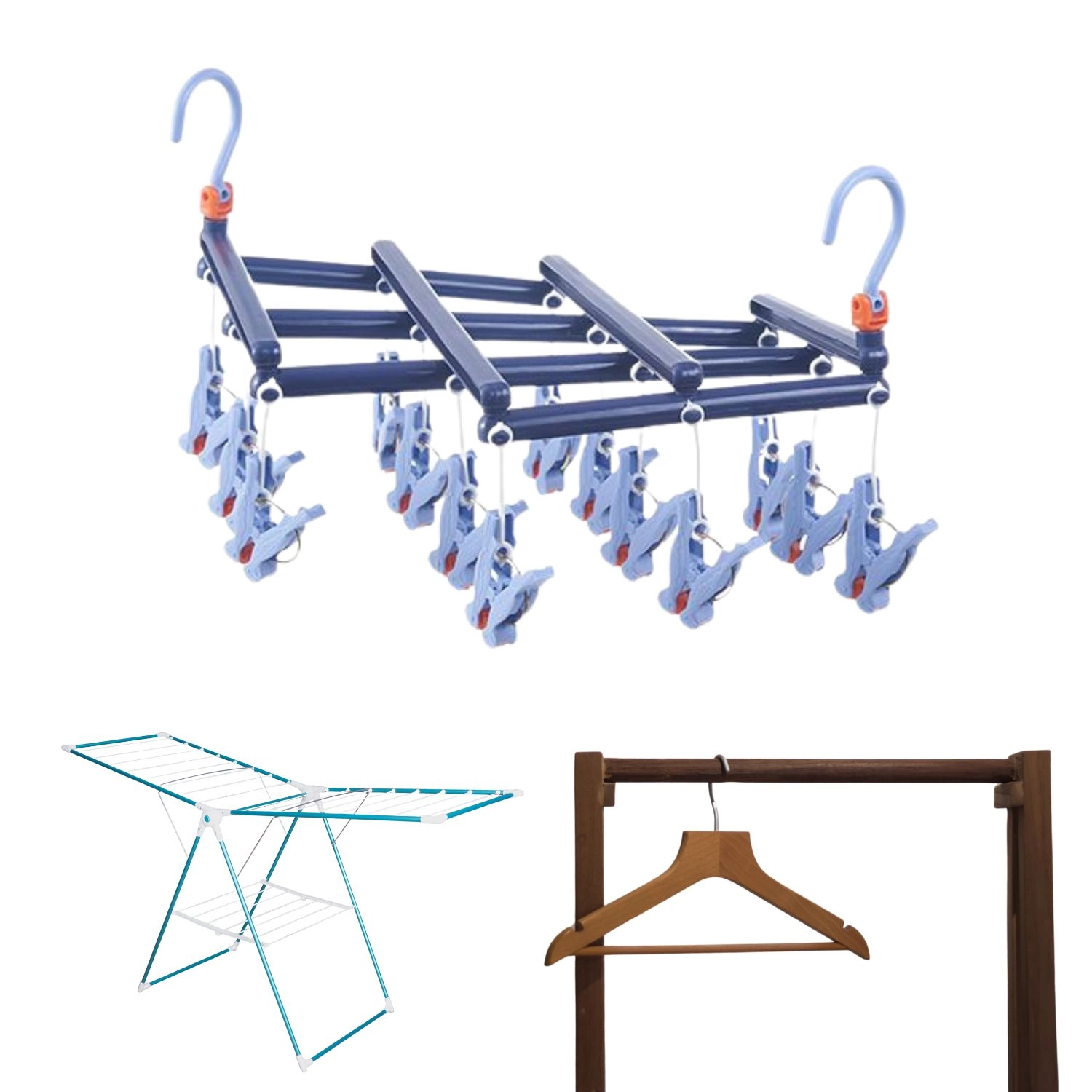 Dankzij de compacte afmetingen na het opvouwen bespaar je ruimte in de kast en tijdens transport. Ergonomische clips met perforatie houden de stof stevig vast en zijn tegelijk zacht voor materialen, zodat wasgoed niet wegglijdt of vervormt. De donkerblauwe uitvoering oogt bovendien schoon en elegant.