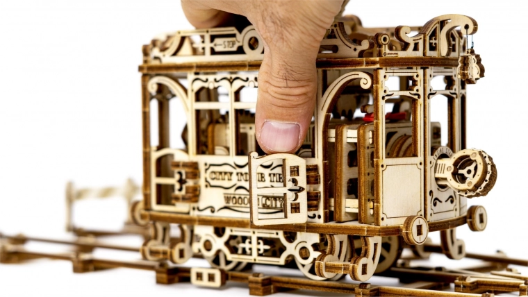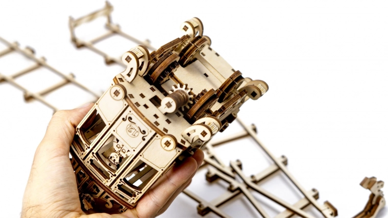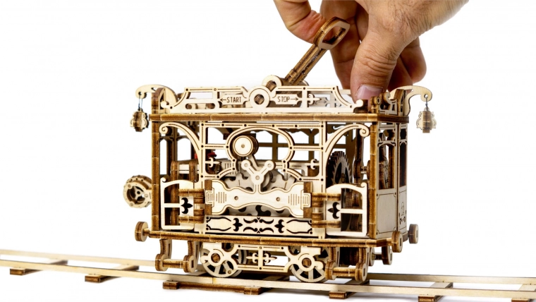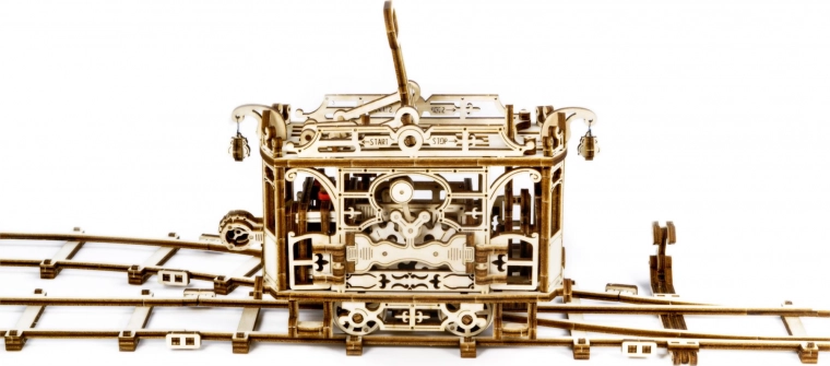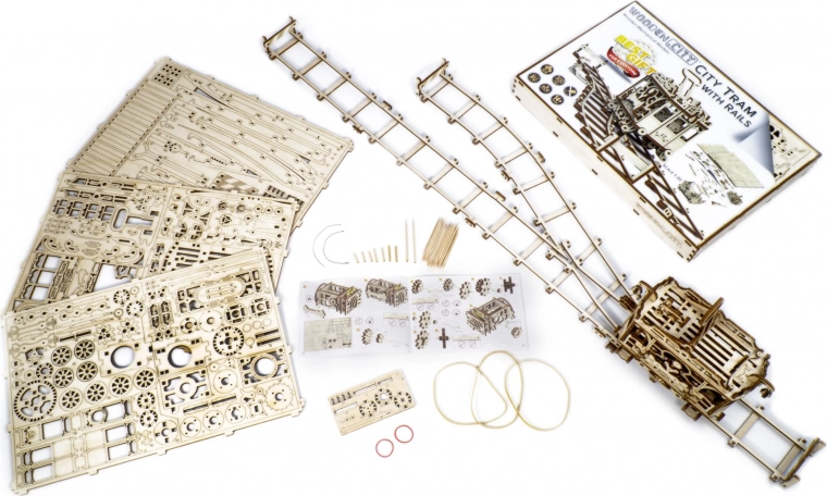 Deze nauwkeurig uitgesneden tram van berkenmultiplex biedt een authentieke mechanische ervaring – van tandwielen en overbrengingen tot de elastiekmotor. Na montage rijdt de tram over de meegeleverde rails en verrast je met soepele werking en een elegant design.