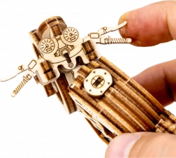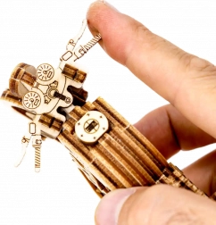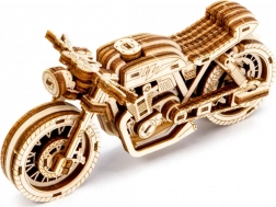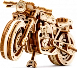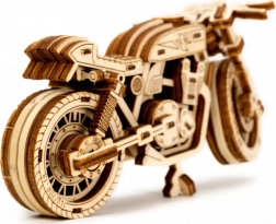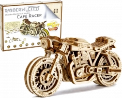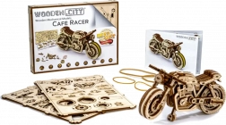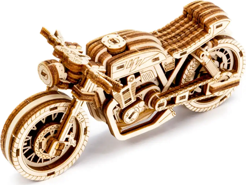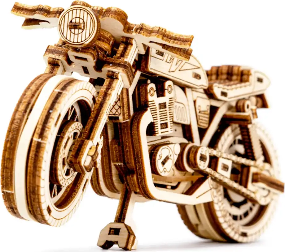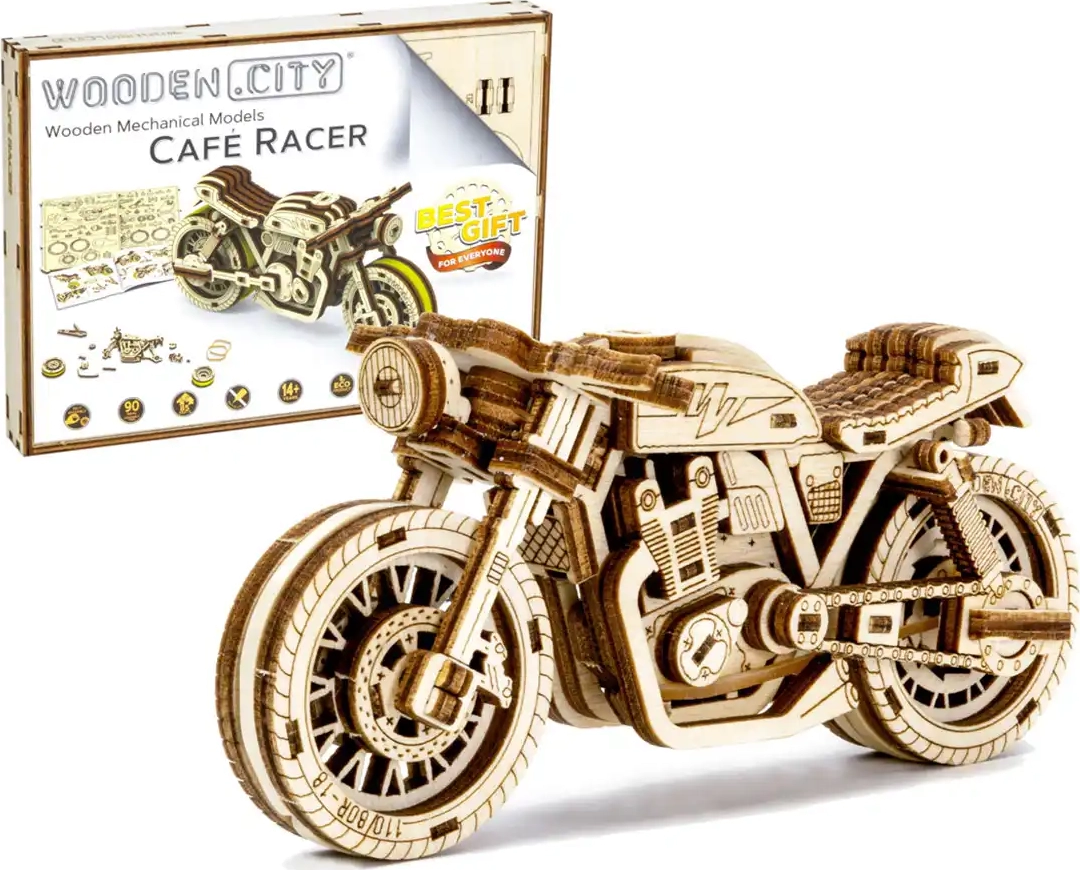 De Café Racer-motor van WOODEN CITY is een gedetailleerd houten model op schaal 1:16 dat je bureau of vitrinekast tot leven brengt. Dankzij de elastiekmotor en de terugtrekfunctie beweegt het model voor- en achteruit, haalt het een afstand van ongeveer 1 meter en biedt het zicht op echte tandwielmechanica.