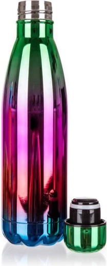 De FLAMENCO thermosfles met een inhoud van 500 ml heeft een buiten- en binnenkant van roestvrij staal en een kunststof dop. Dankzij de dubbelwandige constructie behoudt de drank langer zijn temperatuur. De thermosfles heeft een zeer opvallend, glanzend design in regenboogkleuren.