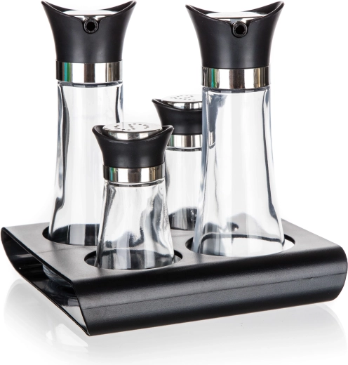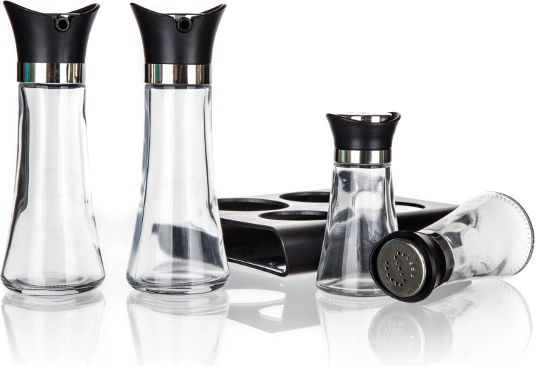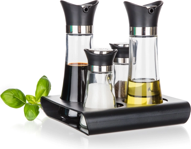 Twee dispensers voor olie en azijn (110 ml) en twee kruidenpotjes voor zout en peper (60 ml) in een stevige standaard houden je tafel overzichtelijk en elegant.