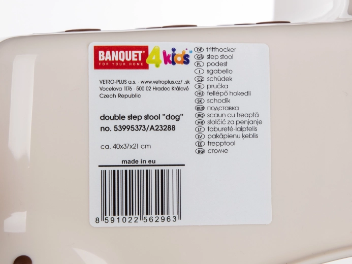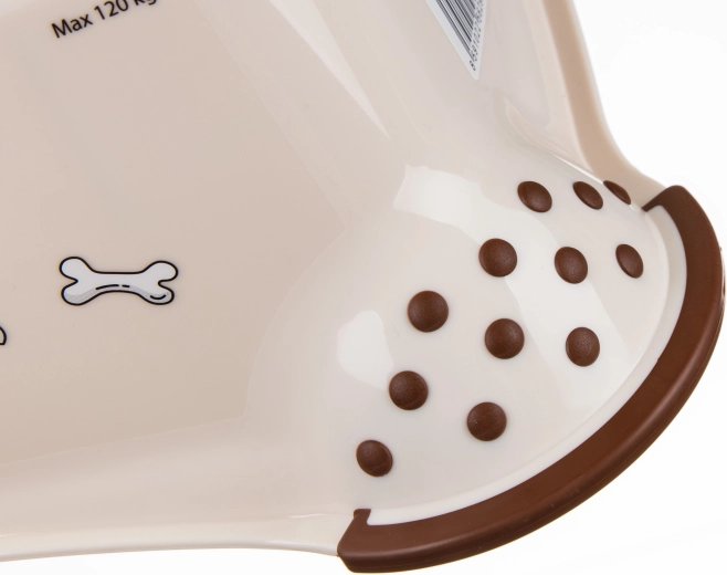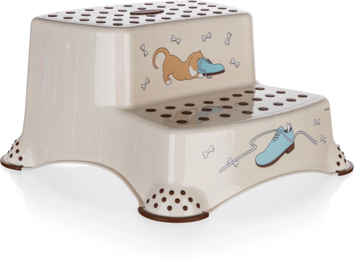 De beige tweestaps opstap met het speelse DOG-motief is ideaal voor kinderen in de badkamer, keuken of kinderkamer. Antislipnoppen op de treden en antislipvoetjes aan de onderzijde zorgen voor zekere stappen op zowel natte als droge ondergrond. Dankzij de compacte afmetingen 40,5 × 37 × 21 cm is hij gemakkelijk te verplaatsen en op te bergen.