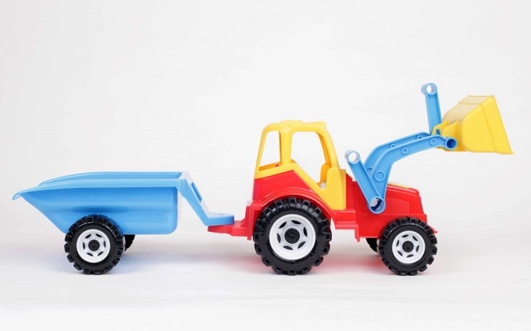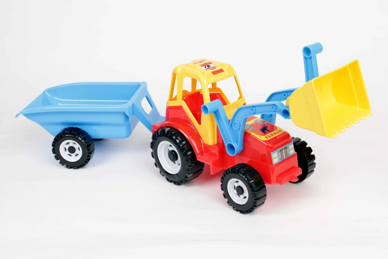 Tractor met voorlader met mogelijkheid om de bak te heffen, waarmee geladen zand kan worden vervoerd. De kleurrijke plastic tractor is achteraan uitgerust met een gekoppelde tweewielige aanhanger die doet denken aan een grote kruiwagen. Dankzij de tweewielige as kan de aanhanger na loskoppeling eenvoudig naar achteren kiepen, wat het lossen van de inhoud mogelijk maakt. De tractor is bovendien versierd met interessante stickers die lichten imiteren.