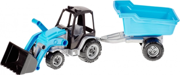 Tractor met een brede, beweegbare voorlader aan de voorzijde van het speelgoed en een afneembare aanhangwagen aan de achterzijde. De blauwe aanhangwagen, die naar achteren kan kiepen, is geplaatst op een enkelassig chassis. De set heeft bewegende elementen die het spel van uw kind aantrekkelijker maken en zijn ontwikkeling positief beïnvloeden.