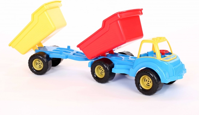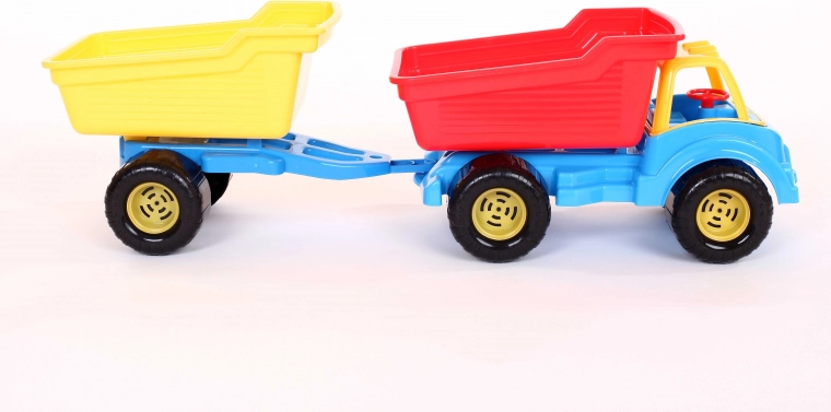 Speelgoedkiepwagen met torsie-aanhanger; de kiepwagen is ideaal om mee te spelen in de zandbak of op het strand. Het is geweldig vermaak voor kleine bouwers, omdat zowel de wagen als de aanhanger het vervoeren van spullen en zand mogelijk maken. De aanhanger kan worden losgekoppeld.