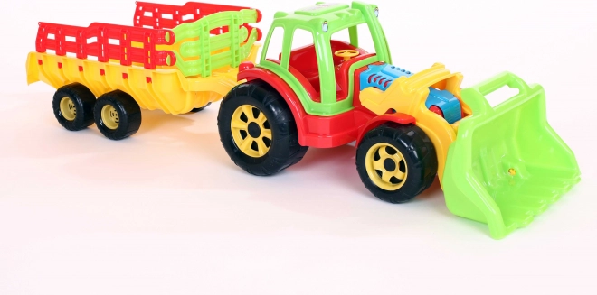 Deze tractor met aanhangwagen en lader is een must voor elke kleine boer. De set is gemaakt van originele materialen en kleurstoffen die geen zware metaalverbindingen bevatten en voldoet daarom aan alle veiligheidsvoorwaarden.