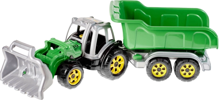 Robuuste tractor met grote lader en hoge aanhanger, ideaal voor kinderspel. Deze tractor biedt veilige en creatieve speelpret.
