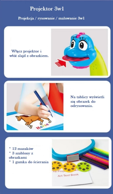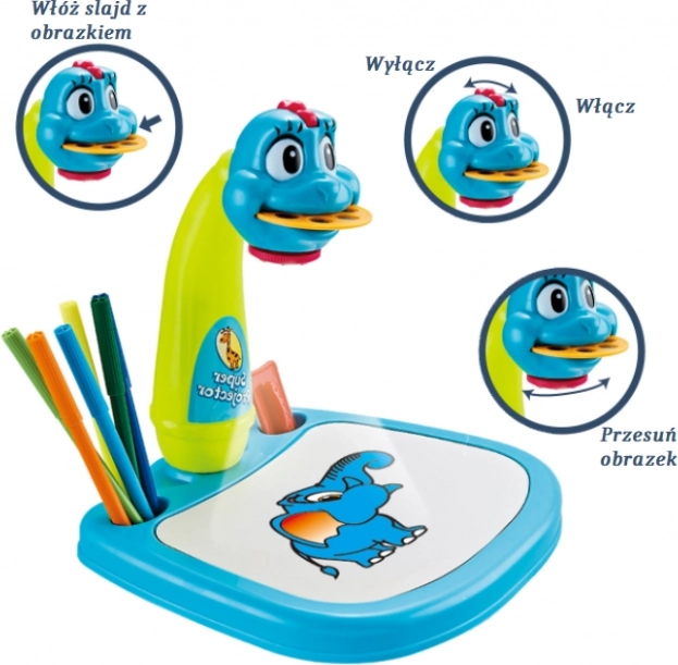 De schattige leerprojector in de vorm van een blauwe dinosaurus is een ideale keuze voor alle kleine kinderen die graag tekenen. Deze multifunctionele projector heeft veel interessante ontwerpsjablonen om over te trekken. Het product vergemakkelijkt het leren tekenen, het overtrekken van lijnen en het creëren van nieuwe vormen; het kind leert spelenderwijs ook kleuren herkennen.