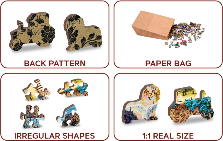 Het leggen van een puzzel met verschillend gevormde stukjes is moeilijker en vormt een grotere uitdaging dan het leggen van een klassieke puzzel. De puzzel is bovendien dubbelzijdig: je kunt leggen op basis van de afbeelding (voorkant) of op basis van de vormen (achterkant met patroon). Het merk WOODEN CITY vergeet naast het unieke puzzelconcept de ecologie niet: bij deze producten vind je geen plastic verpakkingen. Met uniek gevormde stukjes die bekende gebouwen, objecten of dieren uitbeelden volgens het thema van het motief. Hogere moeilijkheidsgraad bij een kleiner aantal stukjes – het leggen van een puzzel met verschillend gevormde stukjes is veeleisender.