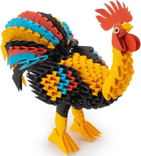 De complete set bevat 517 papieren modules waarmee je een indrukwekkende haan in levendige kleuren kunt maken – een ideaal project voor geduldig knutselen.