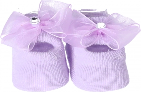 Zachte paarse babyschoentjes met een decoratieve strik en een klein rond steentje voor extra stijl.